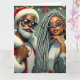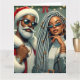 Tomten och en följeslagare är redo att fira, båda iförda stilrena jul-tema kläder. De står mot en bakgrund av julbelysning och dekorationer, redo för en festlig sammankomst.