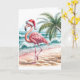 En flamingo som bär en tomtehatt rullar längs en sandstrand med vinkar som lätt kraschar i närheten Text kan ändras.