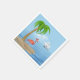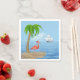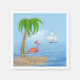 Rosa flamingo med julsockel och jul handflatan träd i strand och med båt och hav vatten.
