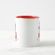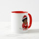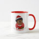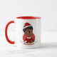 Jul mugg med en illustration av en söt, leende afrikansk flicka med en Afro-hårstil bär flickan en Jultomten-kostym med en röd hatt och en present; i en röd cirkel på en röd bakgrund, med en redigerbar textmall för ditt namn eller meddelande