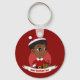 Nyckelkedja med en illustration av en söt, leende afrikansk flicka med en Afro-hårstil, flickan bär en Jultomten-kostym med en röd hatt och håller en present, i en röd cirkel på en röd bakgrund, med en redigerbar textmall för ditt namn eller meddelande