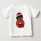 Barns T-shirt med en illustration av en söt, leende afrikansk flicka med en Afro-hårstil, flickan bär en Jultomten-kostym med en röd hatt och håller en present, i en röd cirkel, med en redigerbar textmall för ditt namn eller meddelande