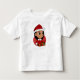 Utformning med en illustration av en söt, leende lycklig-flicka med långt brunt hår, hon bär röd och vit Jultomten-dräkt och håller en present; helgdagar med vit bakgrund under julen