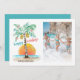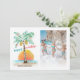 Det platta jokertecknet på tropisk strand har en ö i sol med en handflatan-träd som är dekorerad med ljus och prydnadsföremål och en "glad helg"-hälsning tillsammans med ett utrymme för att ersätta exempelfotot med ditt eget. Art av KL Lagrar