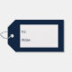 Desteis ursprungliga illustration av en festlig grönt fir träd-garland som är dekorerad med en stor röd båge, röda julbalkar och en del faux ljus. Bakgrunden till färg är mörk blått. På framsidan finns det ett anpassningsbara textområde som nu lyder: "God jul" och på baksidan finns en "till" och "från"-ruta.