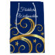 Denna stora storleka presentsäck visas i en fantasifull, djärv, guldfärgad färgad med God jul-text på framsidan. Visas i Sapphire Blue och guld-tone. Text överst på Frohliche Weihnachten. Anpassa den här väskan eller köp som det visas.