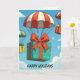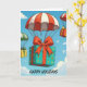 Julpresentboxar flyter i himmel under färglöst strimlat fallskärm, tillsammans med snöflingor och moln. Text kan ändras.