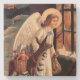 Underlägg med en ängel från himlen med en liten hjort med julklappar tittar i fönstret vid jul Kväll för att skapa fred och god vilja.
