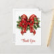 Tack-kort med en festlig julbåge i rött och gult. Omgiven av julstjärnor, tall och juldekorationer.