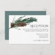 Vackra, eleganta och moderna bröllopsinbjudningskort för ditt speciella tillfälle! Designen matchar resten av julkollektionen "Christmas Joy". Perfekt för den glada och glädjefyllda vinterjulssäsongen! En vattenfärg-målning med mörkgröna barrträdsblad och bruna kottar formar en ram högst upp till vänster på bröllopskortet, vänd på kortet och upptäck ett vinterlandskap med en snasalvia grön bakgrund. Anpassa med detaljer om din bröllopsfest, inklusive tid, plats och andra detaljer som parkering eller transport.