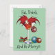 En söt röd drake i ett martiniglas som håller en grön oliva. Julprydnader, en julpresent och gröna oliver runt omkring.