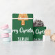 Modern julklapp i för barn, med en minimalistisk utformning som omfattar ett gingerbröd figur i Santa, ett gingerbröd i Julafton träd, snöflingor, hälsning, "God jul" i snyggt i typografi och personlig namn. På grönten Julafton.