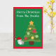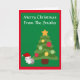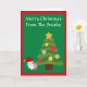 Bedårande personlig julkort med julgran och bedårande katt i tomtehatt. God Jul hälsning på framsidan.
