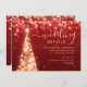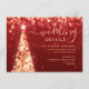 Elegant och festlig julgran i guld och rött bröllopsdetaljkort-/informationskortmall, med adress och instruktioner för festen, glitterljus julgran och modern typsnittsstil.
