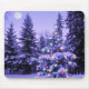 Lilor med viktig av rosa och vit. Tänd julgran på natten i den snöig skogen vid månsken.
