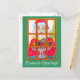 En söt och fantasifull bild av tomten som tänder menorahljusen pryder detta vykort.