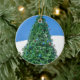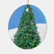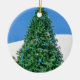 En nära bild av ett vackert Julgran på en vit och blå bakgrund tryckt på ett runt Julgran-ornament.