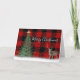 Grönten jul, gräs träd med skinn hjort, guld klockor och fågel som bär vinterscarf på röda och svarta bufflar som pläderar för God jul.