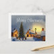 Målning av en Julgran omgiven av hus i byn på en dyster dag. De snö-täckta husen och träd är upplysta med en gatulampa. Roligt och unikt julkort. God Jul!