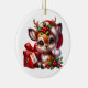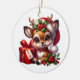 Denna keramiska dekoration i Julgran visas i en rund form med en julklapp i helgdag. Anpassa det här objektet eller köp som det är. Licensierad utskrift
