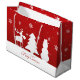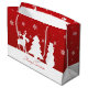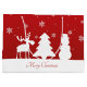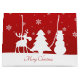 Modern minimalistisk enkel julillustration med vita silhuetter av renar, träd, snögubbe och snöflingor med God jul hälsning mot röd bakgrund.