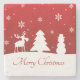 Modern minimalistisk enkel julillustration med vita silhuetter av renar, träd, snögubbe och snöflingor med God jul hälsning mot röd bakgrund.