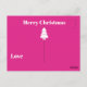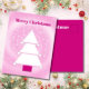 Byt ut er önskemål med denna moderna, stripade juldesign. Genom att fortfarande använda det traditionella säsong-färgen användor den här designen rosa och vitt. Det vita träd har dekorationer som hänger på det och ligger i en virrvarr av stjärnor och snöflingor. Det finns utrymme för ditt helgdag-meddelande på baksidan med ord "Kärlek" som kan tas bort om du inte vill använda det. Modern och enkel jul hälsning.