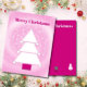 Ge dina julhälsningar en modern twist med denna juldesign. Traditionella säsongsfärger används fortfarande, men nu i rosa och vitt. Den vita granen har hängande dekorationer och är insvept i en virvel av stjärnor och snöflingor.