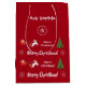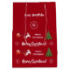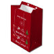 Modern julklappspåse med orden "God Jul" i stilfull typografi, snöflingor, en illustration av en enhörning (med man och svans med röd och gyllene glitter) som drar Santa i sin släde, och ett julträd. På en röd bakgrund. Personlig med namnet/namnen på barnet högst upp.