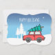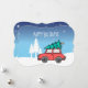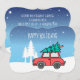 Anpassad skissad liten röd bil med nyss hackad julgran på toppen.