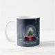 En stor snö-jordglob med en fuktig röd bas som innehåller ett dekorerat Julgran med en ljus gult stjärna på översta och färglöst presenter sitter i en snöskog nattetid med fullt måne i bakgrunden.
