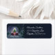 En stor snö-jordglob med en fuktig röd bas som innehåller ett dekorerat Julgran med en ljus gult stjärna på översta och färglöst presenter sitter i en snöskog nattetid med fullt måne i bakgrunden.