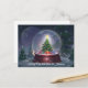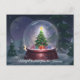 En stor snö-jordglob med en fuktig röd bas som innehåller ett dekorerat Julgran med en ljus gult stjärna på översta och färglöst presenter sitter i en snöskog nattetid med fullt måne i bakgrunden.