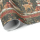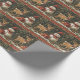 Vacker julklappspapper med en söt snöman som bär en röd hatt och röd halsduk. Det finns en hjort som står bredvid honom med ett rött satinband runt halsen. Marken är pudrad med snö och bakgrunden är mörkgrön med träd och järnek.