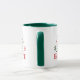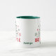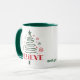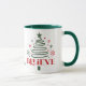 "BELIEVE" säger den stiliserade röda texten på mugg. Ovanför texten finns en modern konst som ritats av Helgdag träd och stjärna. Snöflingor dekorerar båda sidorna av träd. Bilden skrivs ut två gånger på mugg, med ditt namn vid grund mellan bilder.