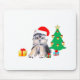 Söt Yorkshire valp som sitter nära en julgran och presenter konst målning.