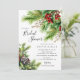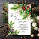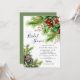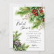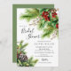 Denna eleganta vinterbröllopsinbjudan har vackra granar med heliga bär och kottar. Inbjudan är perfekt för att fira den blivande bruden under högtiden. Den övergripande designen är festlig och sofistikerad, och inbjudan kommer säkert att imponera på dina gäster.