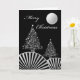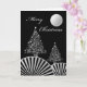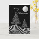 Julgranar och Måne, Modern Silver-kort. God jul hälsningskort med modernt silver-tonat Julgranar och geometriskt cirkelformat snöskitigt backe mot svart bakgrund. En silvud måne ligger i himlar ovanför träd. Lägg till namn eller annan text i omslaget om det behövs. Art, bild och versell copyright © Shoaff Ballanger Studios.
