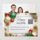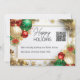 En vacker och lyxig design med en tjock rektangulär guldram där falska gyllene vinter-3D-snöflingor och blad vilar. De övre och nedre vänstra och högra hörnen har dekorativa, utsirade röda, gröna och gyllene julgransprydnader inklämda i sig som är prydda med ömtåliga och överdådiga gyllene virvlar och dekorativa motiv. Svarta mallar för din anpassade text visas inuti ramen och kan anpassas för att passa dina behov. Likaså QR-kodinsatsen (ändra till din egen kod eller logotyp) på framsidan och fotomallen på baksidan. Dessa är idealiska för både personlig och affärsmässig användning under den festliga högtiden. God jul!