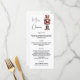 Julkort med meny för julmiddag. Personliggör och lägg till ett namn/händelse, datum och menyn. Vit bakgrund, svart text. Dekorerad med en dammig rosa nötknäppare. Text: God Jul