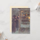 Vintageillustration i viktoriansk stil med glada människor som väntar utanför i snön för att gå på en vinterfest. God jul önskar vi!