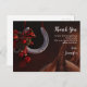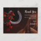 Tack-kort med ett foto som visar en hängande hästsko prydd med ett buffelrutigt band och juldekorationer. Även toppen av en häst huvudet och öronen är synliga.