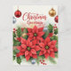 Julhälsningar, färgstarka poinsetter med festliga prydnadsföremål.