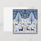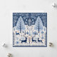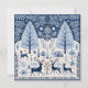 En vacker illustration av en skogsscen med hjortar, träd och djur i en blå färgpalett, skandinaviskt inspirerad konst, detaljerade lövverksmönster, traditionella nordiska motiv och ett rustikt trähus synligt i bakgrunden. En dekorativ ram bildas runt alla elementen. Designen inkluderar detaljer såsom hjorthorn, vilda blommor, blad, eldflugor, stjärnor och djurspår. En vacker design för alla dina julfiranden!