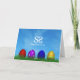 Glad påsk illustration med färgstarka, färgade Påskägg i gräset med blå himmel i baksidan och "Glad påsk"-typografi med vita moln.