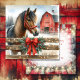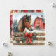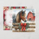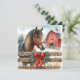 Julhälsningar med häst och röd rustik lada julkort
