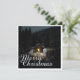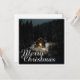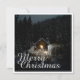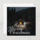 Kortet visar en atmosfärisk vinscen med en liten, belyst trähut mitten i en skog täckt av snö. Den varma ljuskällan skapar en vacker kontrast till mörken, den fredliga omgivningen. Eleganten "God jul" som skriver i vit ge är motivet för en festlig rörelse. 🎄 ✨