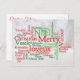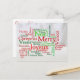 Ett färgglatt rött och grönt ordmoln av God Jul-hälsningar på många av världens språk mot en bakgrund av vita firande dekorationer eller ornament, trädgrenar och snö ger ett glatt välkomnande till alla. God jul önskar vi dig och dina.