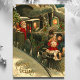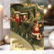 Vacker gammal jul-tåg-kort. "Julhälsningar" skrivet i det nedre vänstra hörnet. Denna design visar en jultomte som är tågkonduktör med två små barn som åker med på framsidan av tåget.