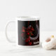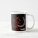 En mugg med ett foto som visar en hängande hästsko prydd med ett buffelbockslakanband och juldekorationer.